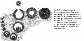 ериод роста протекает в постнатальном периоде, главным образом после полового созревания, хотя и в претубертатном периоде наблюдается рост части фолликулов (малый рост) и вырабатываются эстрогены. С вступлением фолликулов в стадию роста наблюдается активная пролиферация фолликулярных клеток, изменения их формы, формирование прозрачной зоны и сложной соединительнотканной оболочки фолликула с активным развитием в ней микрососудов. В растущих фолликулах эпителий приобретает характер многослойного.