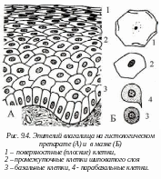 Поверхностные клетки – крупные, плоские, полигональные с эозинофильной (иногда базофильной) цитоплазмой, с темными пикнотическими ядрами и мелкими гранулами гликогена.