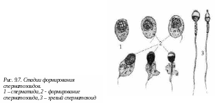 Превращение сперматиды в сперматозоид сопровождается образованием акробласта, а затем акросомы в зоне Аппарата Гольджи, уменьшением в размерах и уплотнением ядра, сползанием цитоплазмы в зону роста хвоста и смещением центриолей - из дистальной центриоли формируется жгутик. Среди клеток сперматогенного эпителия лежат клетки Сертоли, имеющие пирамидную форму.