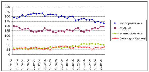 Качественный состав исследуемой выборки за период с июля 2004г. по октябрь 2006г изменился незначительно (Рис.11). В группы с достаточно низким риском дефолта в долгосрочной перспективе, согласно модели, в среднем попадает немногим более 11% всех банков («ВВВ» – 3 банка, «ВВ» – 10 банков, «В» – 35 банков). В среднем 85% всех банков имеют прогнозируемый рейтинг уровня «ССС», «СС» или «С» (86, 185 и 80 банков соответственно). В группу банков с высокой вероятностью неисполнения своих обязательств попадают в среднем 3% банков (с рейтингом «DDD» – 9 банков, «DD» – 3 банка).