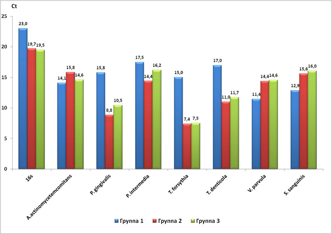 Для изучения состава микробных консорциумов содержимого десневой бороздки у лиц с интактным пародонтом и содержимого пародонтальных карманов у пациентов с ХГП был проведен расчет средних показателей абсолютных значений Ct для общей бактериальной массы и относительного Ct для каждого вида в отдельности в группах пациентов 1, 2 и 3. Результаты расчетов представлены на рисунке 18 и в таблице 4.