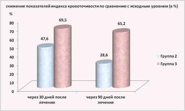 Динамика показателей кровоточивости была аналогичной: через 30 дней после консервативной терапии средние значения индекса Műhlemann-Cowell снизились на 47,6% по сравнению с уровнем до лечения в группе 2 (Рисунок 17) и на 69,5% – в группе 3 (статистическая разница между группами достоверна, р<0,05). Через 90 дней после проведения консервативной терапии индекс кровоточивости по Műhlemann-Cowell у пациентов группы 2 был ниже, чем до лечения, на 28,6%, а в группе 3 – на 65,2% (р<0,05).