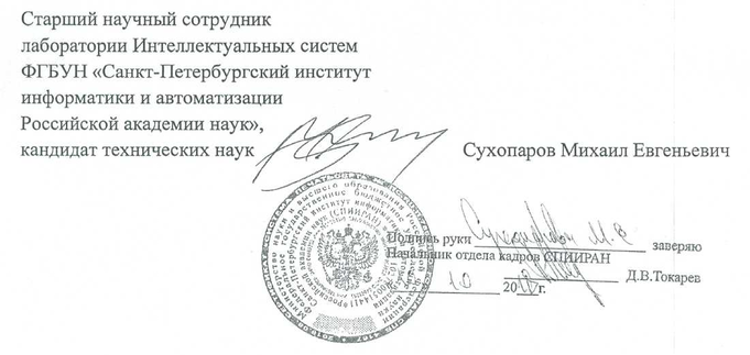 Место основной работы (с указанием структурного подразделения) и занимаемая должность: федеральное государственное бюджетное учреждение науки «Санкт-Петербургский институт информатики и автоматизации Российской академии наук», лаборатория Интеллектуальных систем, старший научный сотрудник.