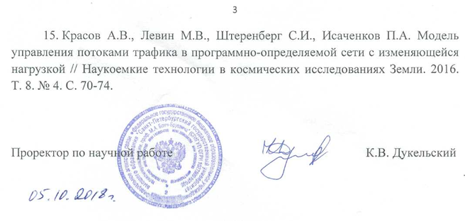 15.Красов А.В., Левин М.В., Штеренберг СИ., Исаченков П.А. Модель управления потоками трафика в программно-определяемой сети с изменяющейся нагрузкой // Наукоемкие технологии в космических исследованиях Земли. 2016. Т. 8. № 4. С. 70-74.