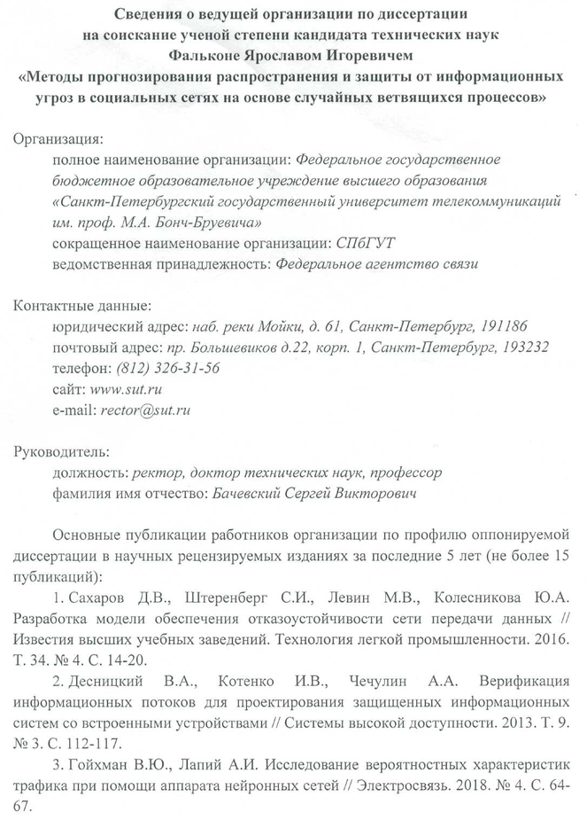 Сведения о ведущей организации по диссертации на соискание ученой степени кандидата технических наук