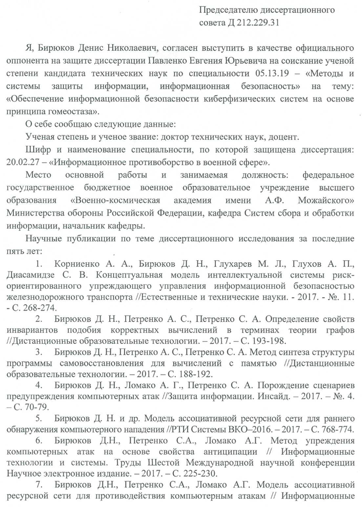 Я, Бирюков Денис Николаевич, согласен выступить в качестве официального оппонента на защите диссертации Павленко Евгения Юрьевича на соискание ученой степени кандидата технических наук по специальности 05.13.19 - «Методы и системы защиты информации, информационная безопасность» на тему: «Обеспечение информационной безопасности киберфизических систем на основе принципа гомеостаза».