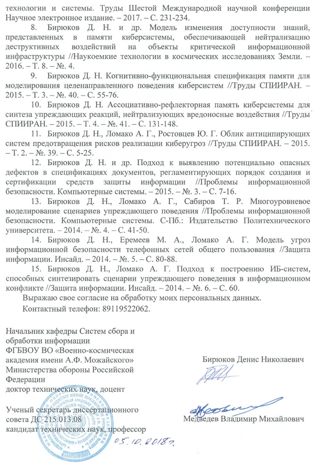10. Бирюков Д. Н. Ассоциативно-рефлекторная память киберсистемы для синтеза упреждающих реакций, нейтрализующих вредоносные воздействия //Труды СПИИРАН.-2015.-Т. 4. -№. 41.-С. 131-148.