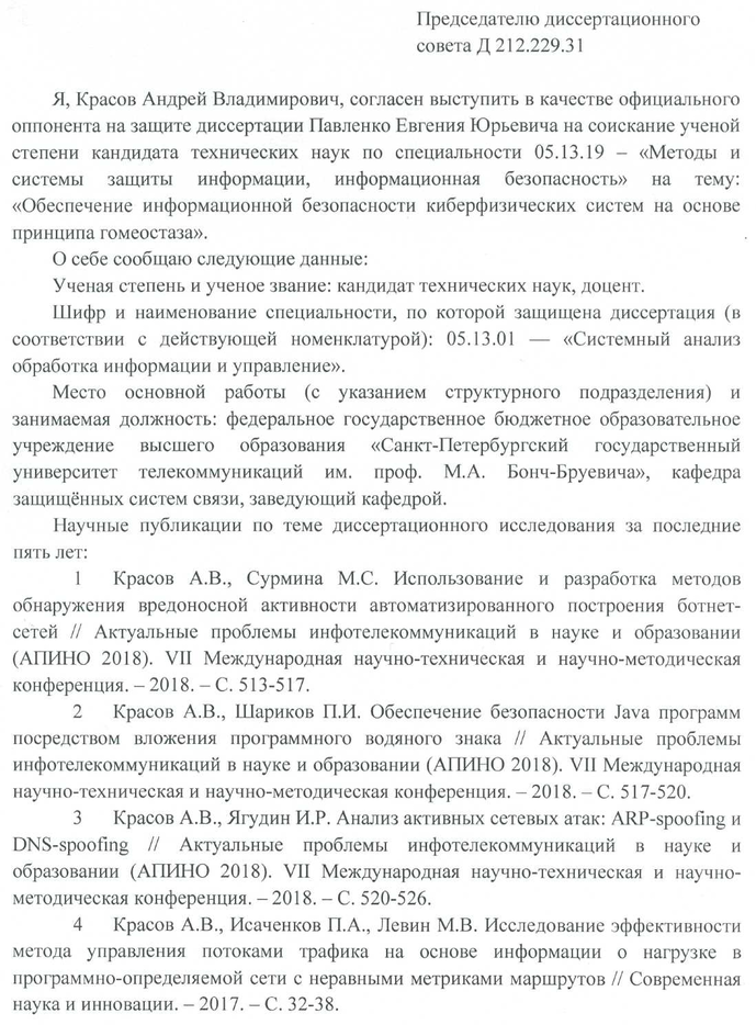 Я, Красов Андрей Владимирович, согласен выступить в качестве официального оппонента на защите диссертации Павленко Евгения Юрьевича на соискание ученой степени кандидата технических наук по специальности 05.13.19 - «Методы и системы защиты информации, информационная безопасность» на тему: «Обеспечение информационной безопасности киберфизических систем на основе принципа гомеостаза».