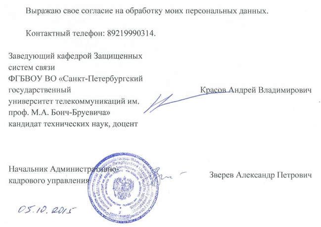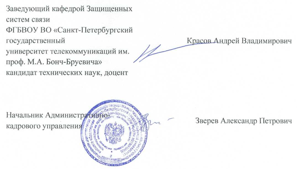 Место основной работы (с указанием структурного подразделения) и занимаемая должность: федеральное государственное бюджетное образовательное учреждение высшего образования «Санкт-Петербургский государственный университет телекоммуникаций им. проф. М.А. Бонч-Бруевича», кафедра защищенных систем связи, заведующий кафедрой.