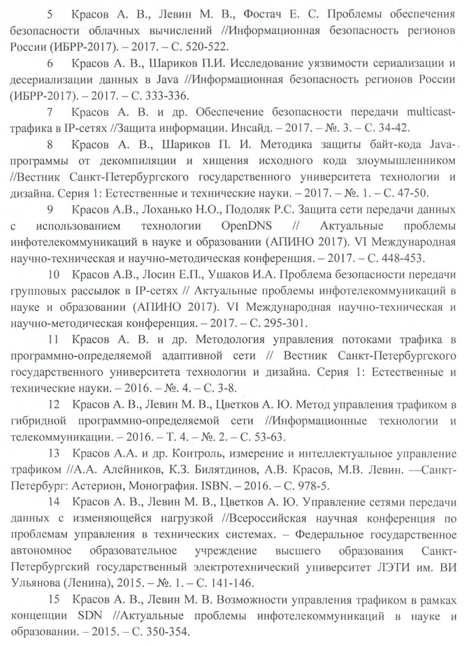 13 Красов А.А. и др. Контроль, измерение и интеллектуальное управление трафиком //А.А. Алейников, К.З. Билятдинов, А.В. Красов, М.В. Левин. — Санкт-Петербург: Астерион, Монография. ISBN. - 2016. - С. 978-5.