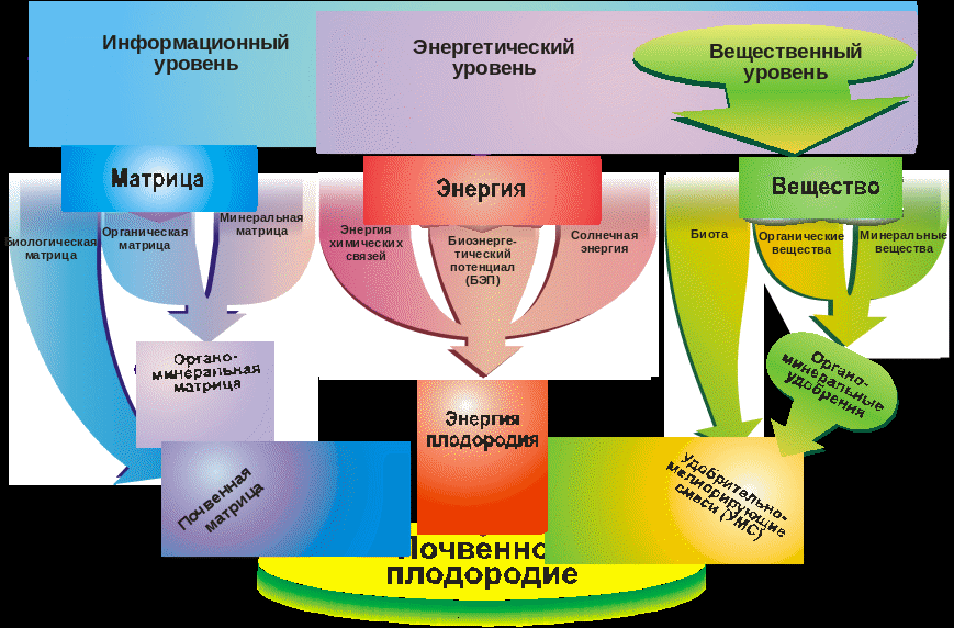 Автором предложена концептуальная модель повышения почвенного плодородия, основанная на трех структурных уровнях воздействия на почву: вещественном, энергетическом и информационном (рисунок 1). Вещественное воздействие вызывает изменение вещественного состава почвы в результате внесения органических удобрений, которые рассматриваются и как источники элементов питания растений. Энергетическое воздействие на почву определяется изменением энергии почвенной системы за счет усиления аккумуляции солнечной энергии и внесения дополнительной энергии с органическими веществами. Энергия химических связей органических веществ трансформируется через биоту в энергию почвенного гумуса. Информационное воздействие на почву обосновывает применение в качестве носителей матриц, источников илистых структур и коллоидов, а также микробных препаратов для расширения объема генетической информации почвенной биоты.