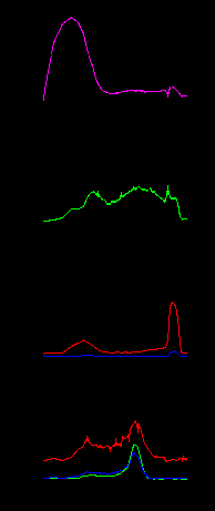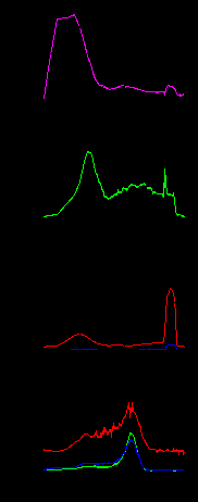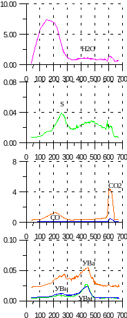| Рисунок 2 – Диаграммы термического масс-спектрометрического анализа препаратов трех фракций гуминовых кислот сапропеля оз. Неро (Ярославская область) Ось х - температура пиролиза гуминовых кислот, ось у- концентрация продуктов пиролиза (мг/г) гуминовых кислот. | ||||||