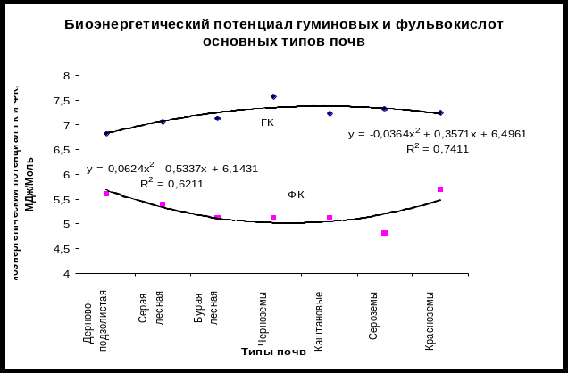 Поступающая в биоценоз энергия аккумулируется в двух его основных объектах: в зеленых растениях и органическом веществе почв, что обеспечивает увеличение продуктивности агроценоза и повышение содержания гумуса в почве. С использованием зависимостей (2) и (3) был рассчитан биоэнергетический потенциал гуминовых веществ основных типов почв и количество аккумулированной энергии в урожае сельскохозяйственных культур. Показано, что гуминовые кислоты аккумулируют больше энергии, чем фульвокислоты (рисунок 6). Выявлены зональные закономерности изменения энергии ГВ: наибольшей энергией обладают ГК черноземов, к северу и югу БЭП гуминовых кислот снижается; для ФК просматривается обратная закономерность.