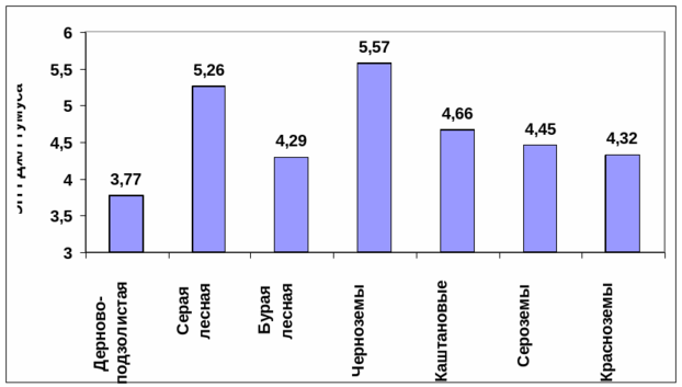 Рисунок 7 – Биоэнергетический потенциал гумуса различных типов почв, ГДж/т