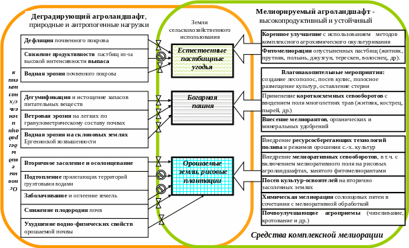 Анализ и системное обобщение работ П.П. Бегучева, З.Ш. Шамсутдинова, В.И. Петрова, Н.Н. Дубенка, К.Н. Кулика, Л.В. Кирейчевой, О.А. Лачко, И.О. Ибрагимова, Л.В. Рудневой, В.Ф. Шматкина, Ю.П. Добрачева, Н.З. Шамсутдинова, Н.Л. Цаган-Манджиева, Б.А. Гольдварга, и др. позволили автору разработать концептуальную модель повышения природно-ресурсного потенциала деградированных сельскохозяйственных угодий средствами комплексной мелиорации (рис. 3). Модель отражает взаимозависимость деградационных процессов, протекающих на землях сельскохозяйственного использования, обусловленных природными и антропогенными факторами. Применяемые методы комплексной мелиорации дифференцированы по их воздействию для каждого вида земель сельскохозяйственного назначения и направлены на повышение природно-ресурсного потенциала.