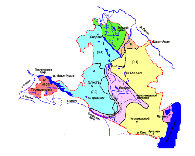 обводнительно-оросительные системы: I - Черноземельская; II - Сарпинская; III -Калмыцко-Астраханская; IV - Право-Егорлыкская; V - Каспийская; VI - местный сток;