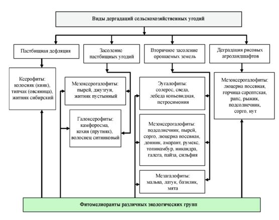 земель с использованием нетрадиционных культур-освоителей, диверсификация культур-мелиорантов для восстановления длительно используемых в рисовом севообороте земель. Выполнена классификация фитомелиорантов, используемых для повышения природно-ресурсного потенциала в зависимости от вида деградации сельскохозяйственных угодий, с учетом их отношения к экологическим факторам внешней среды (рис.5).