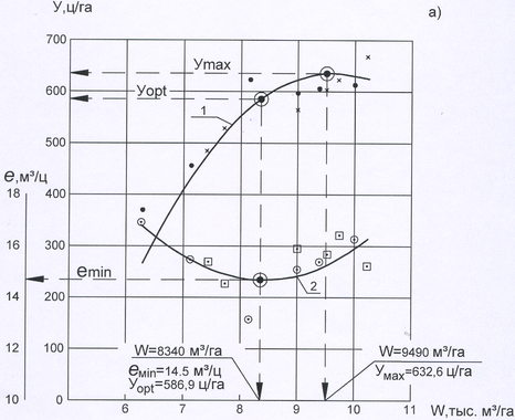 В работах С. К. Колотовой (1931), В. Р. Вильямса (1946), А. Н. Костякова (1961), С. И. Долгова (1969) показано, что действие воды на развитие растений протекает по волнообразной кривой. Анализ полученных экспериментальных данных относительно удельных затрат воды на единицу продукции также свидетельствует о нелинейной зависимости между изучаемыми факторами. В связи с тем что орошение применяется с целью получения планируемой урожайности сельскохозяйственных культур, нами выполнен регрессионный анализ зависимости урожайности культур от уровня их влагообеспечения, а также зависимости удельных затрат воды на единицу продукции от суммарных затрат воды, использованных для получения планируемой продуктивности культур. Расчеты, выполненные в абсолютных значениях, позволили аппроксимировать зависимости квадратичными уравнениями типа:
