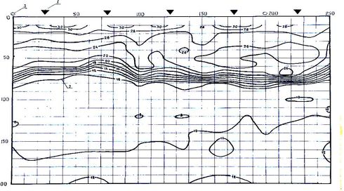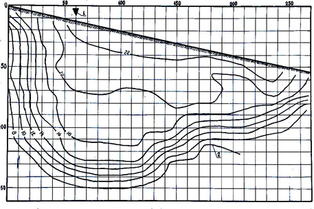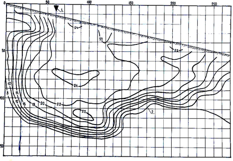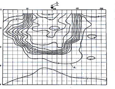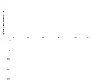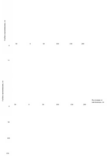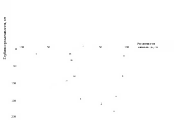 При уклоне 0,2 диаметр контура увлажнения отличается от теоретически установленного и имеет сильно выраженное смещение в сторону склона. Распределение влаги вверх по склону от капельницы составляло до 0,50 м, а вниз до 2,00 м, середина контура смещена от капельницы на 0,40м, при глубине увлажнения 1,20 м. На поверхности участка наблюдается овальный контур, направленный по уклону. Смещение контура увлажнения в сторону от капельницы (таблица 4, рисунок 8) превышает 1,50...2,00м, что делает затруднительным проведение поливов без специальных приемов, обеспечивающих повышение симметричности контура промачивания.