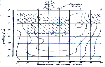 Экспериментальные исследования, проведенные на опытно-производственных участках, были направлены на определение режима орошения, обеспечивающего предотвращение поверхностного стока и глубинного просачивания оросительной воды. Формирование увлажняемой зоны по длине трубопровода определяет особенности выбора числа капельниц, схемы расположения сети и состав ее элементов. Исследования проводились на наиболее типичной для предгорной зоны категории грунтов - темных среднесуглинистых сероземах. Наблюдения показали, что при подаче поливной нормы одной капельницей на ровной, безуклонной поверхности, наблюдается формирование контура увлажнения в соответствии с эпюрой, приведенной на рисунке 5, с четкими границами глубиной до 1,20 м и диаметром до 1,40 м.