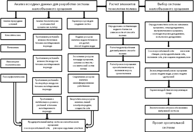 Технология создания модульной системы малообъемного орошения включает анализ исходных данных по природным условиям, расчет элементов технологии поливов, выбор системы малообъемного орошения.