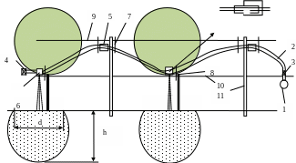 1-распределительный трубопровод, 2-гибкий поливной трубопровод, 3-регулятор расхода,4-перепускное устройство, 5- воздуховыпускное отверстие,6-калиброванное водовыпускное отверстие,7,8-фиксаторы, 9,10-линейные элементы (шпалерная проволока), 11- вертикальные опоры.
