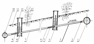 1 – распределительный трубопровод; 2 – регулятор расхода; 3 – поливной трубопровод; 4 – диафрагма; 5 – воздушная трубка; 6 – секции поливного трубопровода; 7 – перфорированные оросители; 8 – водонепроницаемый экран; 9 – колодец; 10 – сбросной трубопровод; 11 – поверхность почвы; 12 – крышка колодца; 13 - растение