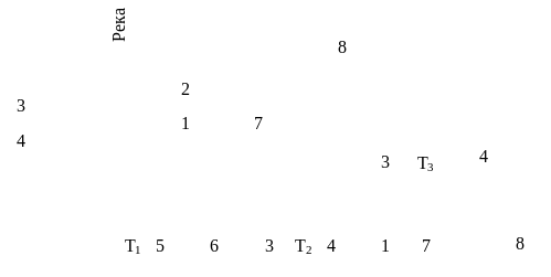 | Рис. 2. Схема распределения твердого стока по элементам оросительной сети: 1 – поверхностные слои потока; 2 – река-водоисточник; 3 – струенаправляющие сооружения; 4 – донные слои потока; 5 – шлюз-регулятор стока; 6 – магистральный канал; 7 – регуляторы стока; 8 – распределительный канал; Т1 – точка водоотбора из реки в магистральный канал; Т2 и Т3– точка водоотбора из магистрального канала в распределительную сеть. |