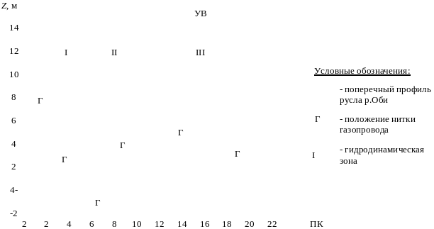| Рис. 6. Поперечный профиль русла и положение нитки газопровода |