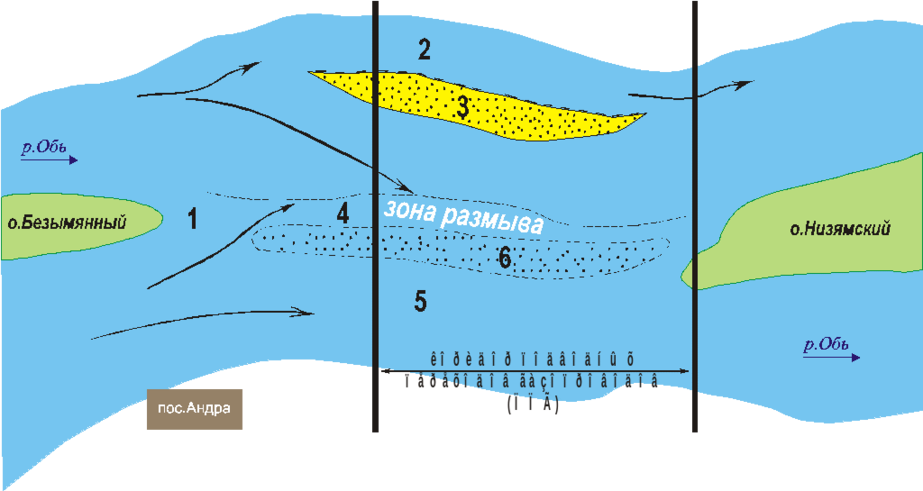 | Рис. 5. Схема участка исследований (р.Обь, участок ППГ, пос.Андра) 1- русло реки; 2- протока; 3- отторгнутый побочень; 4- зона размыва в левобережной части русла; 5- правобережная часть русла; 6- осередок |