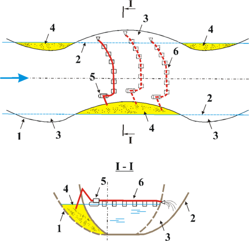 Результаты исследований эффективности данного способа формирования динамически устойчивого русла (подводные переходы через р.Обь и Алешкинскую протоку) показали, что намытые грунтовые массы интенсивно размываются в случае, если их поверхность не защищена слоем грунта из крупных фракций. Поэтому для обеспечения дополнительной устойчивости русла от размыва разработан технологический режим создания гидромеханизированным способом защитного поверхностного слоя (патент № 2108424).