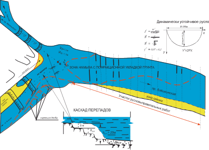 Технические решения по ремонту подводного перехода через Алешкинскую протоку включали создание динамически устойчивого русла путем перемещения грунта из зоны заиления в правобережной части в зону размыва в левобережной части для выравнивания полей скорости водного потока с ее понижением до величины, близкой к неразмывающей скорости, рис.11. Для защиты от размыва левого берега предусмотрены направляющие разрезные шпоры, обеспечивающие гашение энергии потока и его равномерное распределение за шпорой. Этот прием позволяет частично выровнять скорости по сечению и, тем самым, погасить поперечную циркуляцию потока, характерную для криволинейных участков русел.