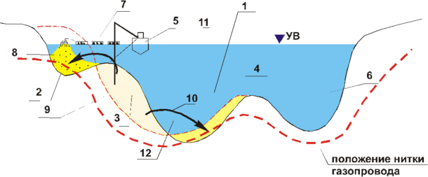| Рис. 10. Поперечное сечение русла р.Обь при проведении русловыправительных работ 1 - русло реки; 2 - протока; 3 - побочень; 4 - зона размыва, замывается земснарядами; 5 - земснаряд; 6 - правобережная часть русла; 7 - плавучий пульповод; 4 и 8 - зона намыва грунта земснарядами; 9 - русло после проведения русловыправительных работ; 10 - направления перемещения грунтовых масс; 11 - русло реки до производства работ; 12 – левобережная часть русла |