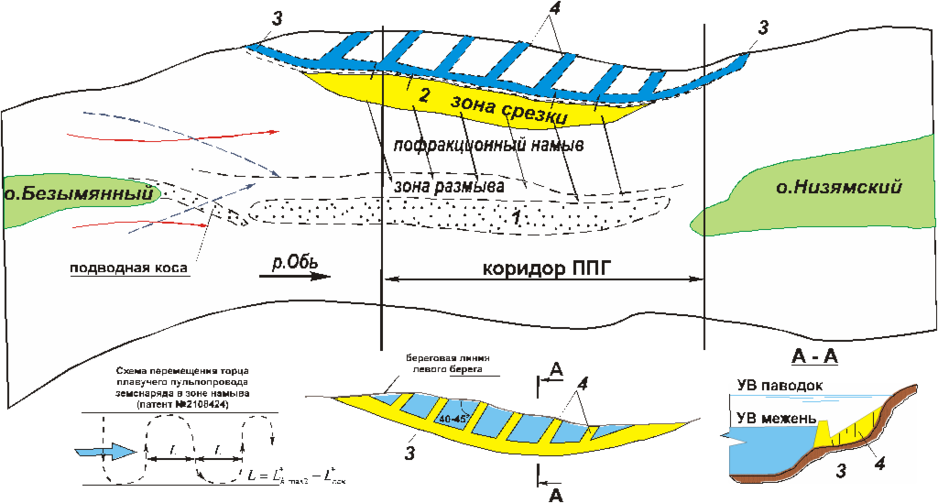 Методы расчета русловых деформаций и способы защиты гидротехнических сооружений были апробированы на подводных переходах через р.Обь и Алешкинскую протоку в процессе проведения ремонтных работ. Кроме комплекса работ по формированию динамически устойчивого русла было выполнено проектирование и строительство защитных гидротехнических сооружений (короткие разрезные шпоры, намыв косы), см. рис. 8.