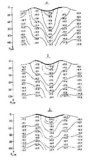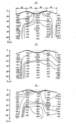 а) в голове борозды; б) в створе 30 м; в) в створе 60 м