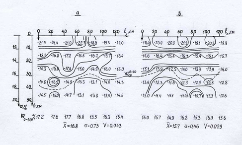 Рисунок - 2. Распределение влажности почвы вдоль экранированной борозды