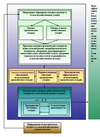 В систему мониторинга ежемесячно поступает информация об органических отходах и сельскохозяйственных угодьях региона. Производится оценка органических отходов в качестве удобрений и сельскохозяйственных угодий для их использования. Выполняются прогнозы водно-солевого режима, микробиологической активности, накопления азота и гумуса, миграции тяжелых металлов в почве и урожайности сельскохозяйственных культур при использовании органических отходов в качестве удобрений. На основании оценки и прогнозов выдаются рекомендации о возможности использования органических отходов в качестве удобрений, определяются нормы и периоды их внесения, рассчитывается экономическая эффективность использования органических отходов в сельском хозяйстве региона.