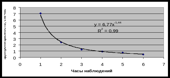 Четвертая глава посвящена результатам экспериментальных исследований. Изучение гранулометрического состава почвы показало, что содержание физической глины в профиле 0-200 см изменяется в пределах от 35 до 41% и согласно Н.А. Качинскому(1943), почва участка относится к среднесуглинистой. Объемная масса, характеризующая сложение и плотность почвы, в слое 0-200 см изменяется в пределах от 1,18 до 1,50 г/см3. Наименьшей объемной массой характеризуется слой 0-30 см, где она составляет 1,25 г/см3. Удельная масса почвы, отражающая минералогический состав и содержание органического вещества в слое 0-200см, изменяется в пределах от 2,64 до 2,73 г/см3. Скважность (порозность) почвы в пределах слоя 0-100 см изменяется от 47,2 до 55,3 % и в среднем составляет 49,6%, а в слое 0-200 см – 48,3 %. Наименьшая влагоемкость (НВ) в пределах слоя 0-200 см изменяется от 19,54 до 24,92 % от массы абсолютно-сухой почвы. Запас влаги при НВ в слое 0-70 см равен 2108 м3/га, в слое 0-100 см – 3002 м3/га, а в слое 0-200 см составляет 5953м3/га. Установлена эмпирическая зависимость снижения водопроницаемости среднесуглинистых почв во времени (рис.1).