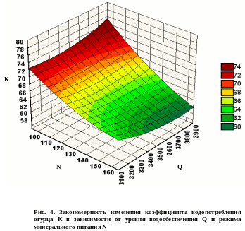 где K – коэффициент водопотребления огурца, м3/т; Q – сумма оросительной и атмосферной влаги, поступившей за сезон на орошаемый участок, м3/га; N – доза внесения минерального азота, кг д.в./га (как элемента, находящегося в минимуме минерального питания растений в регионе).