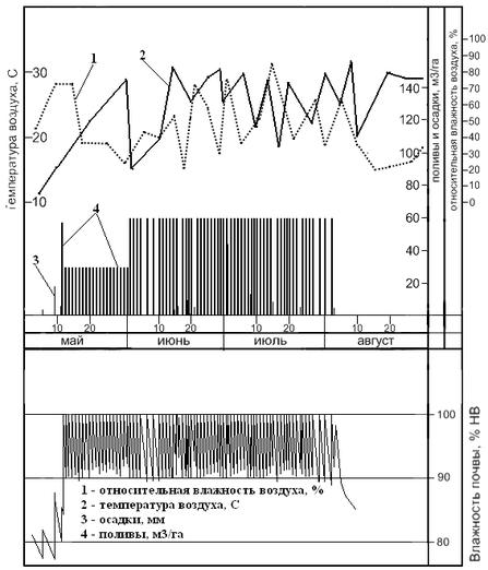 Множественный коэффициент корреляции полученной зависимости составляет 0,88, (все компоненты уравнения значимы на p = 0,05 уровне), что свидетельствует о достаточно высоком влиянии изучаемых факторов на коэффициент водопотребления посевов огурца. Таким образом, используя в формуле вида: