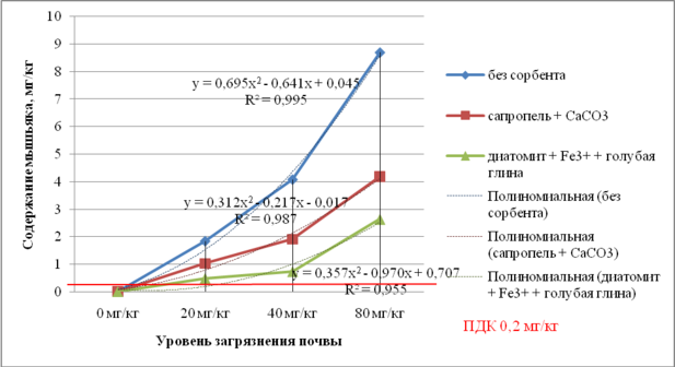 Диатомит, обработанный Fe3+, в смеси с голубой глиной снизил содержание мышьяка в зерне до 0-0,01 мг/кг (табл. 1). Содержание мышьяка в корнях данный сорбент снизил на 61 % (относительно варианта с уровнем загрязнения 40 мг/кг без внесения сорбентов), в стеблях – на 50 %, в среднем по всем частям растения (2011 г.) произошло снижение в 7 раз. Сапропель+СаСО3 снизил содержание мышьяка в зерне на 67-75 %, в стеблях – на 73 %, в корнях – 46 %. Содержание мышьяка в зерновой продукции в результате применения обоих сорбентов достигло принятых нормативов.