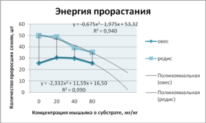 В главе 4 проведена оценка влияния различных доз мышьяка на процесс прорастания семян сельскохозяйственных культур - овса, редиса, салата. В ходе проведения опыта на проростках обнаружено, что при дозе мышьяка до 40 мг/кг происходит стимуляция прорастания семян и развития фитомассы растений, при дальнейшем увеличении дозы до 80 мг/кг мышьяк оказывает заметное токсическое действие на развитие проростков (рис. 4). Однако, несмотря на отсутствие токсического эффекта при небольших дозах мышьяка, в фитомассе происходит его накопление, что делает продукцию, выращенную на слабо- и среднезагрязненных почвах практически непригодной для употреблению в пищу (в соответствии с ПДК в пищевых продуктах, установленной СанПиН 42-123-4089-86).