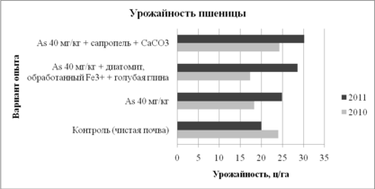 Токсическое действе мышьяка снижает урожайность пшеницы на 24 % относительно контроля в первый год проведения лизиметрического опыта, во второй год испытаний урожайность пшеницы в варианте с загрязненной почвой без сорбентов была выше, чем в варианте с чистой почвой без сорбентов на 24% (рис. 6). Это свидетельствует о том, что самоочищающая способность почвы снизила количество подвижных форм мышьяка до уровня, при котором токсическое действие загрязнителя стало слабее, и мышьяк, напротив, стал действовать как полезный микроэлемент – аналог фосфора. Однако, при этом количество накопленного в зерне мышьяка превышает установленные ПДК. Избыток железа в варианте с применением диатомита, обработанного Fe3+, в сочетании с голубой глиной снижает урожайность пшеницы на 28% относительно контроля в первый год, на второй год в лизиметрах с данным вариантом, напротив, отмечается превышение урожайности на 43 % над контрольным вариантом. В варианте с использованием в качестве сорбента сапропеля + СаСО3 урожайность в оба года проведения исследований больше, чем в контрольном варианте, что объясняется действием сапропеля как удобрения.
