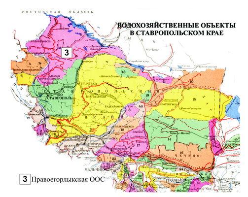 ПЕООС охватывает 6 районов Ставропольского края, расположенных в северной части, а также часть двух южных районов Ростовской области и два юго-западных района Республики Калмыкия (рисунок 6). Назначение системы – обводнение территории на площади 1,5 млн. га, орошение – на площади 153,0 тыс. га для развития товарного производства зерна и кормов.