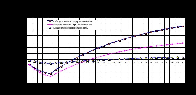 Эффективность проекта оценивалась по дисконтированному сальдо приростного потока от инвестиционной и операционной деятельности, реализуемой в проекте. В качестве дополнительного критерия рассматривался срок окупаемости инвестиций по чистому дисконтированному доходу. Результаты оценки показали эффективность проекта, так как дисконтированное сальдо приростного потока положительно для всех вариантов расчетов эффективности инвестирования в развитие орошения ПЕООС – общественной, коммерческой и бюджетной. Срок окупаемости инвестиций при расчете общественной эффективности равен 9 годам (рисунок 7), коммерческой – 12 годам, бюджетной – 15,5 годам. Достаточно большой срок окупаемости, соответствующий оценке коммерческой эффективности, подтверждает необходимость государственной поддержки развития орошения. При снижении доли затрат товаросельхозпроизводителей на 33% (как это предусмотрено ФЦП «Плодородие») срок окупаемости инвестиций составит – 7,3 года.