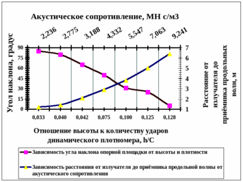 На следующем этапе в траншею закапывались камни с известным объемом для диагностики эффективности определения расположения камней по глубине. Установлены зависимости угла наклона опорной площадки возбудителя от глубины залегания скрытого камня и плотности почвы (рис.5). Изучение форм распространения импульса возбудителя прибора «Сонар—валуномер» позволило определить применяемость его горизонтальной составляющей для определения глубины скрытых камней.