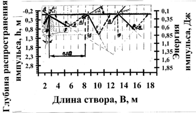 В результате лабораторно-полевых исследований установлены рациональные параметры, при которых обеспечивается надежная диагностика скоплений мелких, средних и крупных камней в слое грунта до 2,0м: - угол отклонения от вертикали отчетливого считывания полезного импульса равен 7,1о: - расстояние между створами сплошной диагностики - до 5 м (при шаге в створе 1 м). установлено, что четкий полезный импульс от неоднородностей появляется на экране в радиусе I…I,5 м от места дислокации камня. Установка обладает максимальной чувствительностью, когда линия расположения излучатель-сейсмоприемник ориентирована на камень. При необходимости обнаружения крупного камня (валуна) необходимо выполнить ряд замеров, в зоне зафиксированного импульса, последовательно приближаясь к центру окружности.