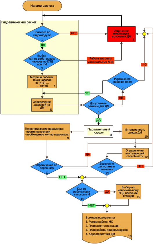 В процессе перебора вариантов включения ДМ формируется такой график производства поливных работ, при котором достигается максимальная эффективность использования оросительной воды и технических средств сети для каждых суток поливного цикла. Сформированный таким образом график гидромодуля будет отвечать введенным ограничениям, а целевая функция (3) будет иметь минимальное значение, поскольку на каждом этапе выбирается максимальный приоритет.