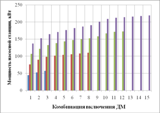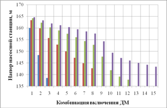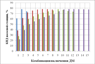 Рис. 11. Параметры насосной станции при изменении комбинации включения ДМ, при разном количестве параллельно работающих насосных установок (НУ)
