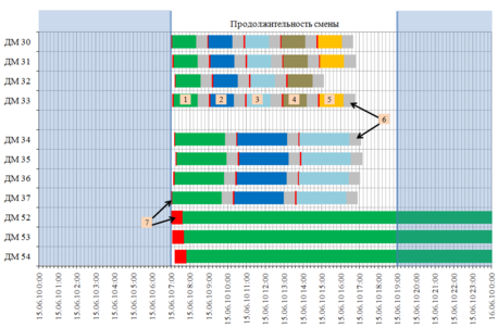 Рис. 10. План занятости машин. (1,2,3,4,5 – порядковый номер позиции; 6,7 – заключительное и подготовительное время соответственно)